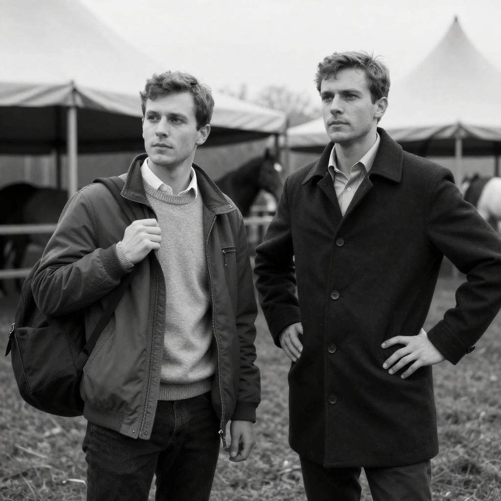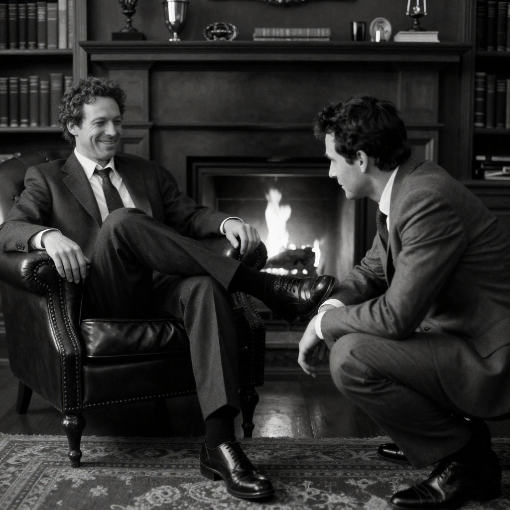 Black and white photograph of two men laughing on a staircase, one leaning forward, wearing a dark jacket and jeans, the other in a patterned shirt and suspenders, with several other men in the background.