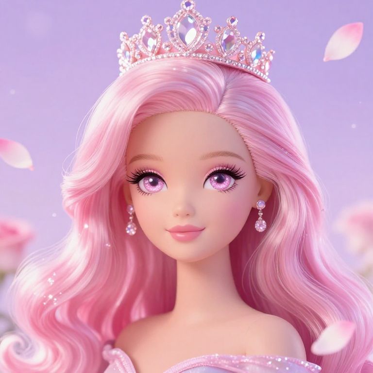 Digital CGI image of a pink-haired doll with large purple eyes, wearing a sparkling tiara and earrings, against a soft blue background with pink flower petals