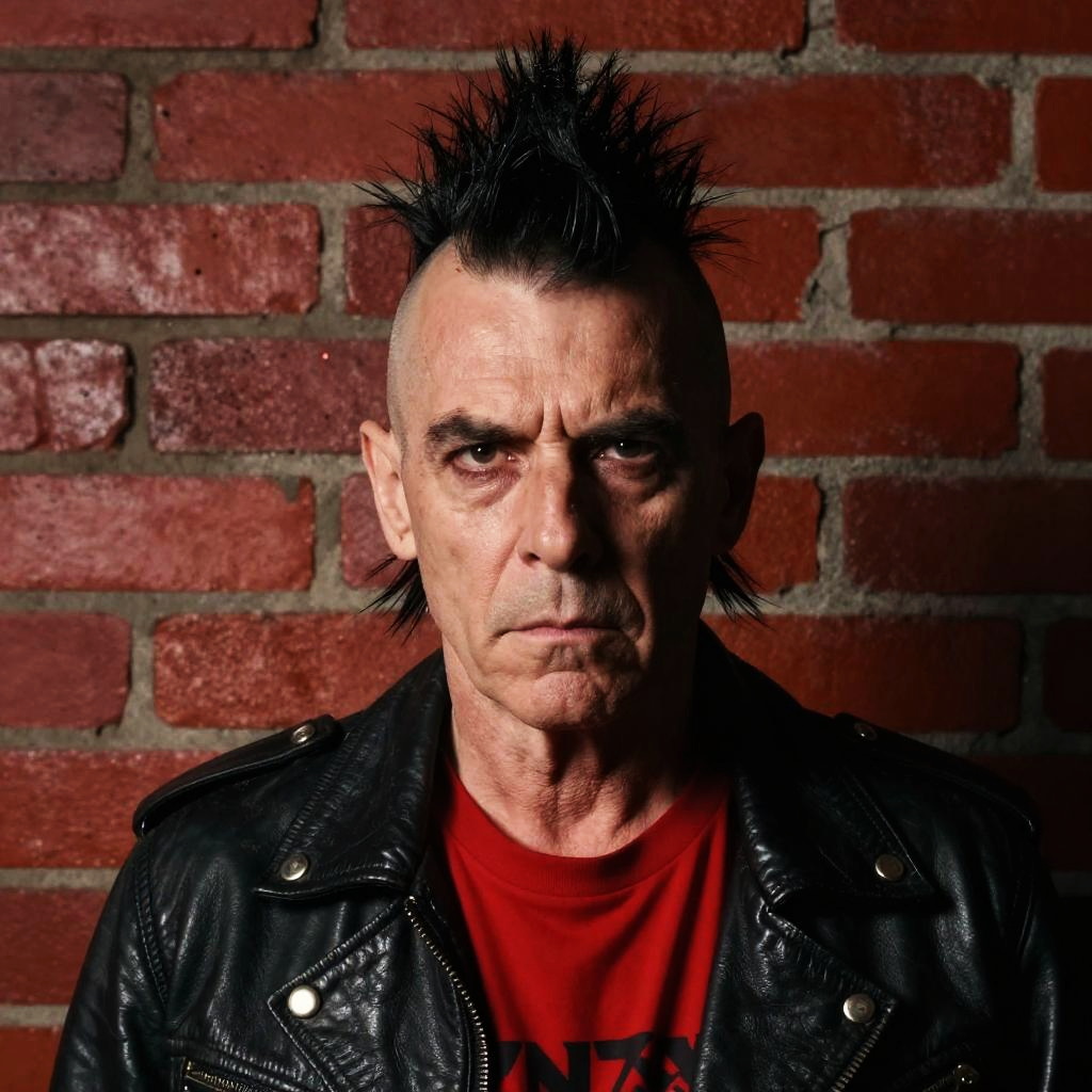 Raw photo, close-up, punk band cover, red brick wall, red theme, a brutal man, 40 years old, mohawk, (manly, wide jaw:1.2), leather jacket, red shirt, (vibrant colors:0.9), film grain, bokeh, fashion magazine, hdr, highly detailed photography, (muted colors, cinematic, dim colors, soothing tones:1.2), vibrant, insanely detailed, hyperdetailed, (dark shot:1.2), (vsco:0.3), (intricate details:0.9), (hdr, hyperdetailed:1.2)