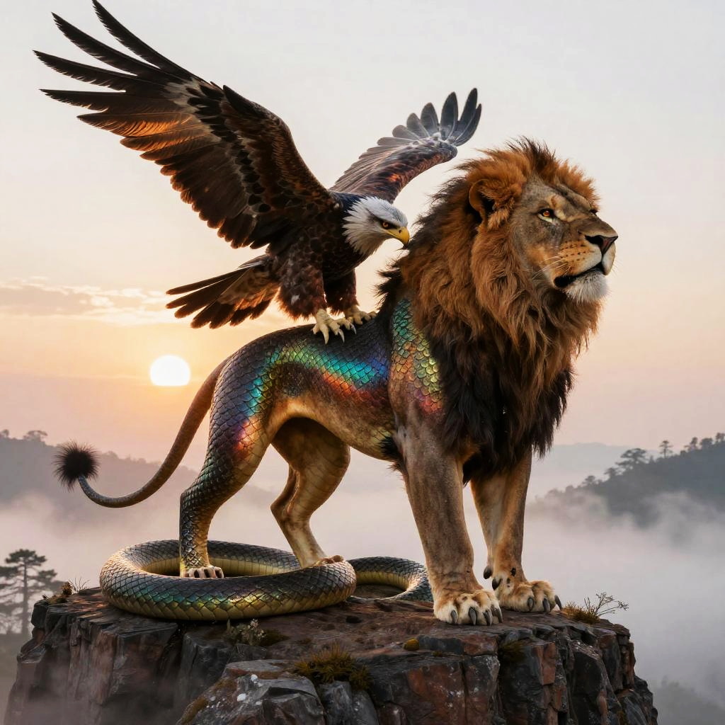 Chimeris creature standing on a misty cliff at sunrise, blending features of lion, eagle, and serpent, detailed scales and feathers, vibrant fantasy colors, dramatic lighting, epic high fantasy art style, intricate textures, dynamic pose