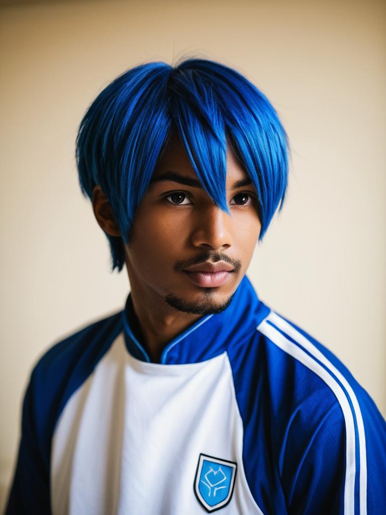 Portrait of a dark-skinned male cosplayer wearing a blue Aomine Daiki costume with short blue hair and blue eyes. He is dressed in a sporty blue shirt with white accents and a logo, captured with natural lighting and shallow depth of field, featuring a soft blurred background.