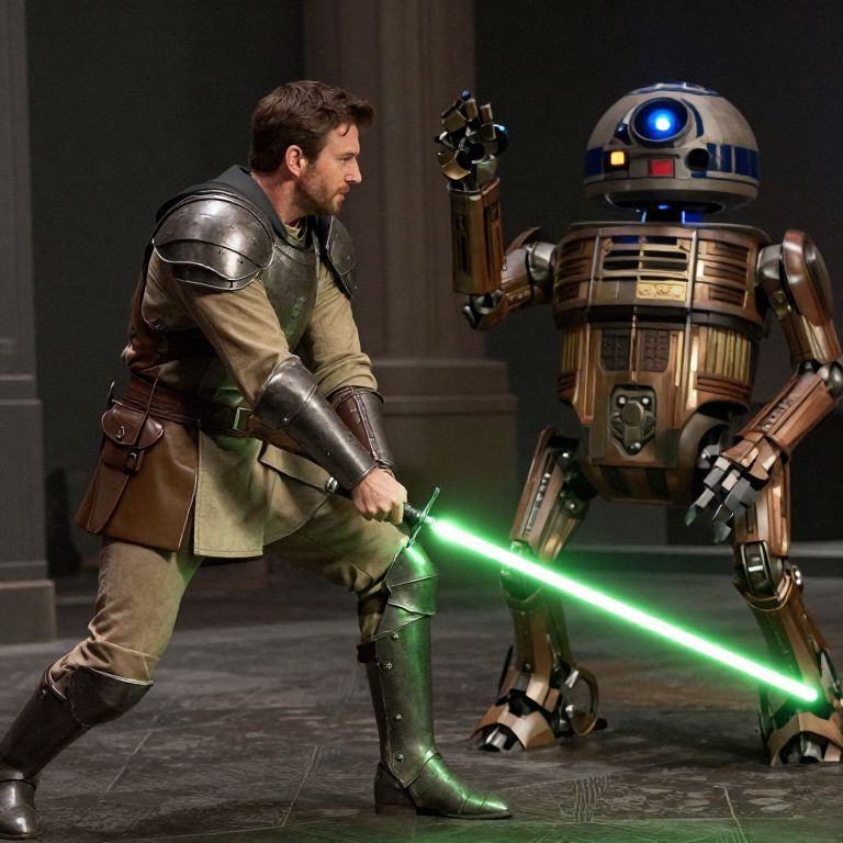 Hatbox Chris Evans as ajedi knight in tanned clothing and green light sabre, fighting a huge warrior droid,