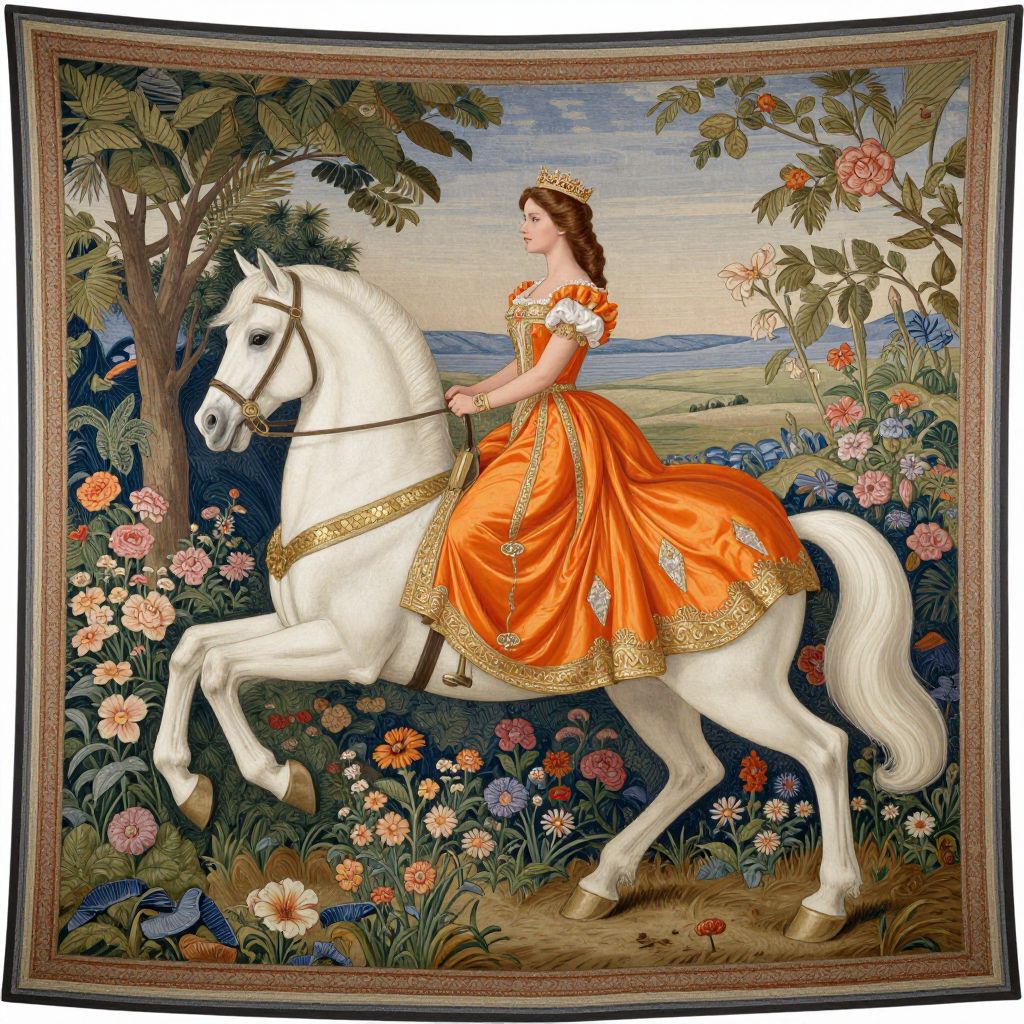 Lady with the Unicorn tapestry-inspired artwork depicting a regal woman in a vibrant orange gown adorned with gold embellishments, gracefully riding a majestic white horse amidst a lush garden filled with colorful flowers and surrounded by ornate floral borders and a serene landscape.