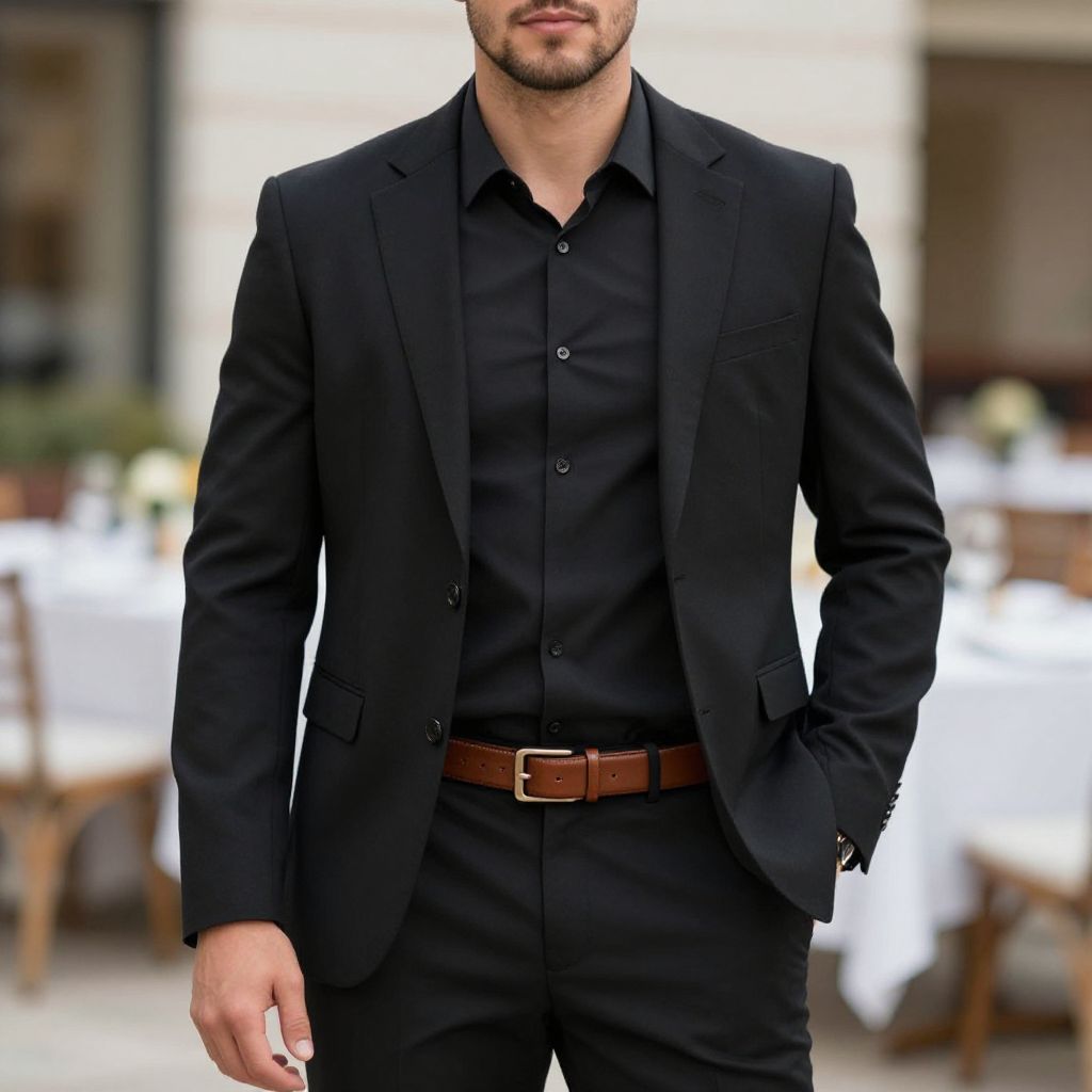Casual dinner attire male, 1boy, male focus, shirt, jacket, belt, realistic, black jacket, solo, hand in pocket, facial hair, blurry background, pants, blurry, looking at viewer, outdoors, brown belt, suit, collared shirt, hands in pockets, open jacket, black pants, brown hair, formal