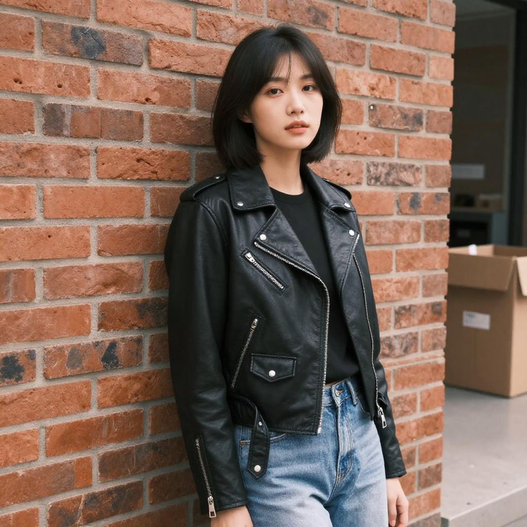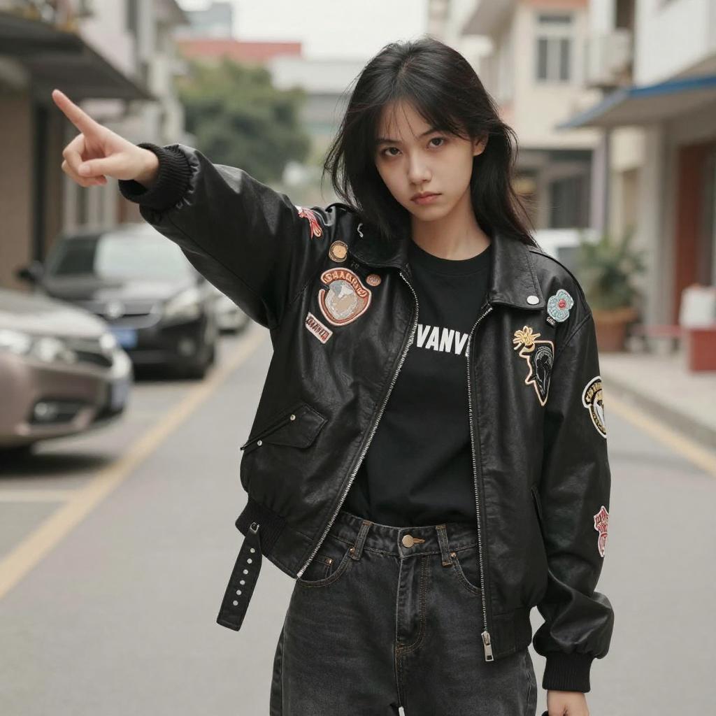 Young Woman in Leather Jacket Pointing