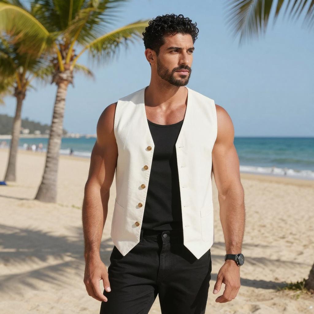 Photograph of a handsome, muscular man with short, curly dark hair standing on a sunny beach. He's wearing a sleeveless, white blazer over a black shirt, with dark blue pants and a black watch on his left wrist. Palm trees and clear blue ocean are in the background, with white sand underfoot. His expression is confident and slightly serious.