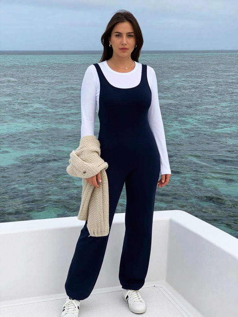 A Pear-shaped body type woman in a casual contemporary style, wearing a navy blue sleeveless jumpsuit layered over a white long-sleeve crewneck T-shirt and white lace-up sneakers, holding a beige chunky knit cardigan. She stands on a luxury boat in the Great Barrier Reef, captured in a camera obscura visual style. Sexy. Pretty face and beаutiful eyes. Big breasts