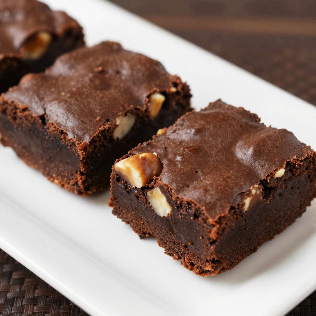 Photograph of a square, rich, dark chocolate fudge brownie with a glossy, slightly cracked chocolate topping and embedded with visible walnut pieces. The brownie sits on a white, square ceramic plate, which is partially visible. The background is softly blurred, featuring a warm, beige textured surface. The brownie's edges are slightly rough, showcasing its dense, moist texture. The walnut pieces add a contrasting texture and color to the dark chocolate. The overall image is brightly lit, highlighting the brownie's rich, decadent appearance.