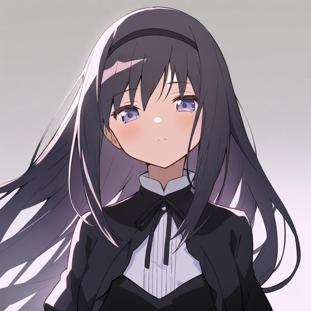 Akemi homura (black dress), mahou shoujo madoka magica, 1girl, purple eyes, black hair, long hair, hairband, funeral dress, by artist yuuki (yuyuki000), animagine