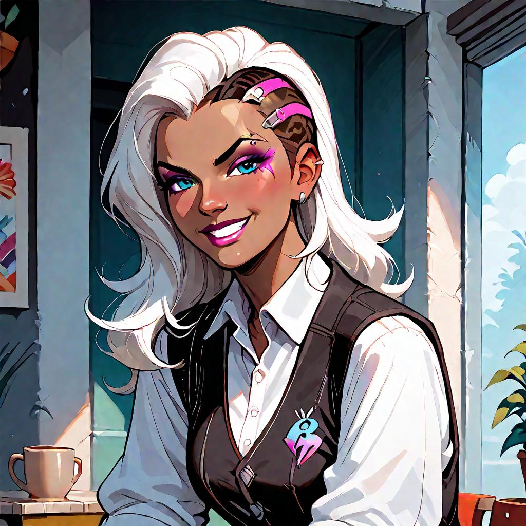 Digital illustration of a confident young woman with long white hair and vibrant makeup, including purple eyeshadow and a smirk. She wears a white button-up shirt under a black vest adorned with a colorful pin. The woman has a modern hairstyle featuring shaved sides with pink clips. She is seated in a sunlit cafe with a coffee cup and potted plant in the background.