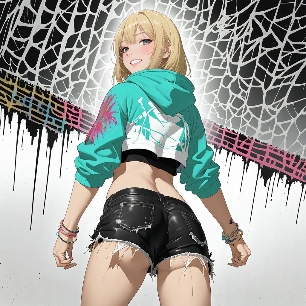 1girl, Erased, girl, blonde hair, ass, solo, shorts, bracelet, hood, jewelry, looking at viewer, breasts, smile, crop top, from behind, short shorts, looking back, lips, multicolored hair, hoodie, black shorts, thighs, grin