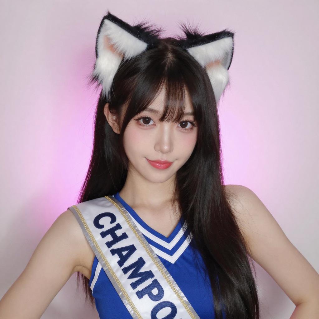 A digital image of a kneeling woman in a blue and white cheerleader outfit with black furry cat ears, holding gold and white pom-poms. She has long black hair, fair skin, and is wearing black gloves. The background includes a white lamp on a wooden floor and a white couch.