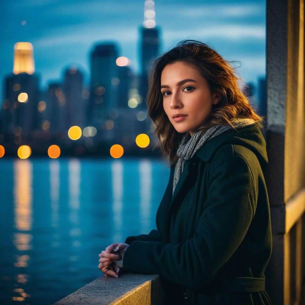 A young woman leaning against a wall in the early morning with a city skyline in the background, soft warm bokeh lights from buildings and street lamps reflecting on water, cinematic and moody atmosphere, detailed facial expression, casual coat, urban night scene