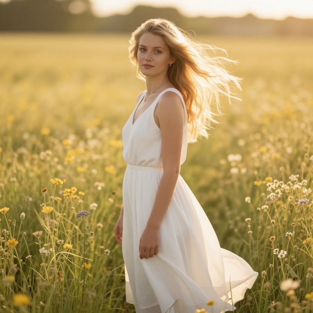 Young woman with blonde hair standing in a sunlit field of wildflowers, soft breeze moving her hair, wearing a flowing white dress, golden hour lighting, dreamy and serene atmosphere