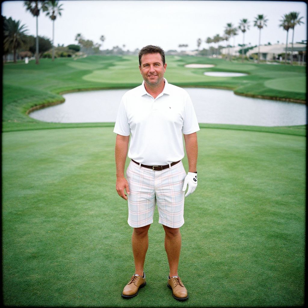 A man, white golf polo, pastel plaid shorts, relaxed fit, tan golf shoes, lush green fairways, sparkling water hazards, towering palm trees, Holga camera style, soft focus, cheerful expression Man has masculine face and piercing eyes