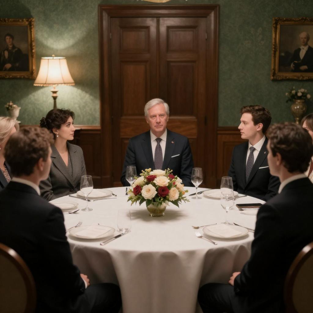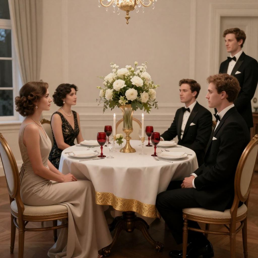 Photograph of a formal dinner party. Long wooden table with ornate chairs, draped in beige fabric with gold trim. Ten people seated, one standing man in black suit. Tall floral centerpieces with pink, white roses. Red wine glasses, silverware, plates. Elegant wooden paneled walls, chandelier. People in formal attire. Men in suits, women in dresses. Standing man looks at seated guests, others engaged in conversation. Rich, warm lighting.