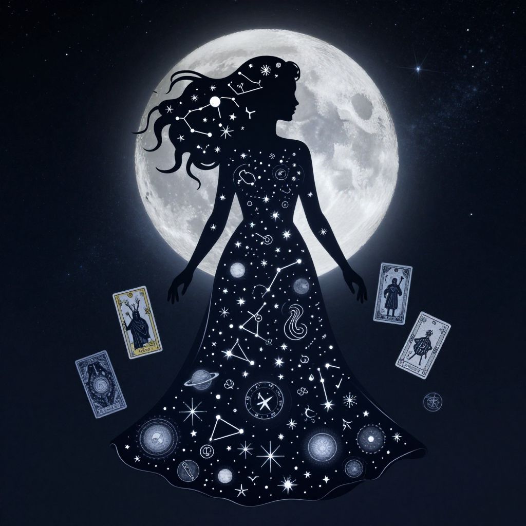 Astrology Oracle Silhouette: Create a mystical silhouette incorporating zodiac elements, The woman's form should be adorned with astrological symbols, with her dress flowing into a star chart, Her hair could be a swirl of zodiac constellations, Within the silhouette, include subtle images of planetary bodies and astrological houses, The background should be a deep night sky with a prominent moon phase, Add tarot card imagery or mystical runes floating around her to enhance the divinatory atmosphere