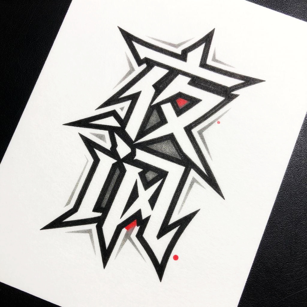 Ren kanji stylized as modern tattoo design, sharp lines and geometric shapes, monochrome with red accents, bold and dynamic