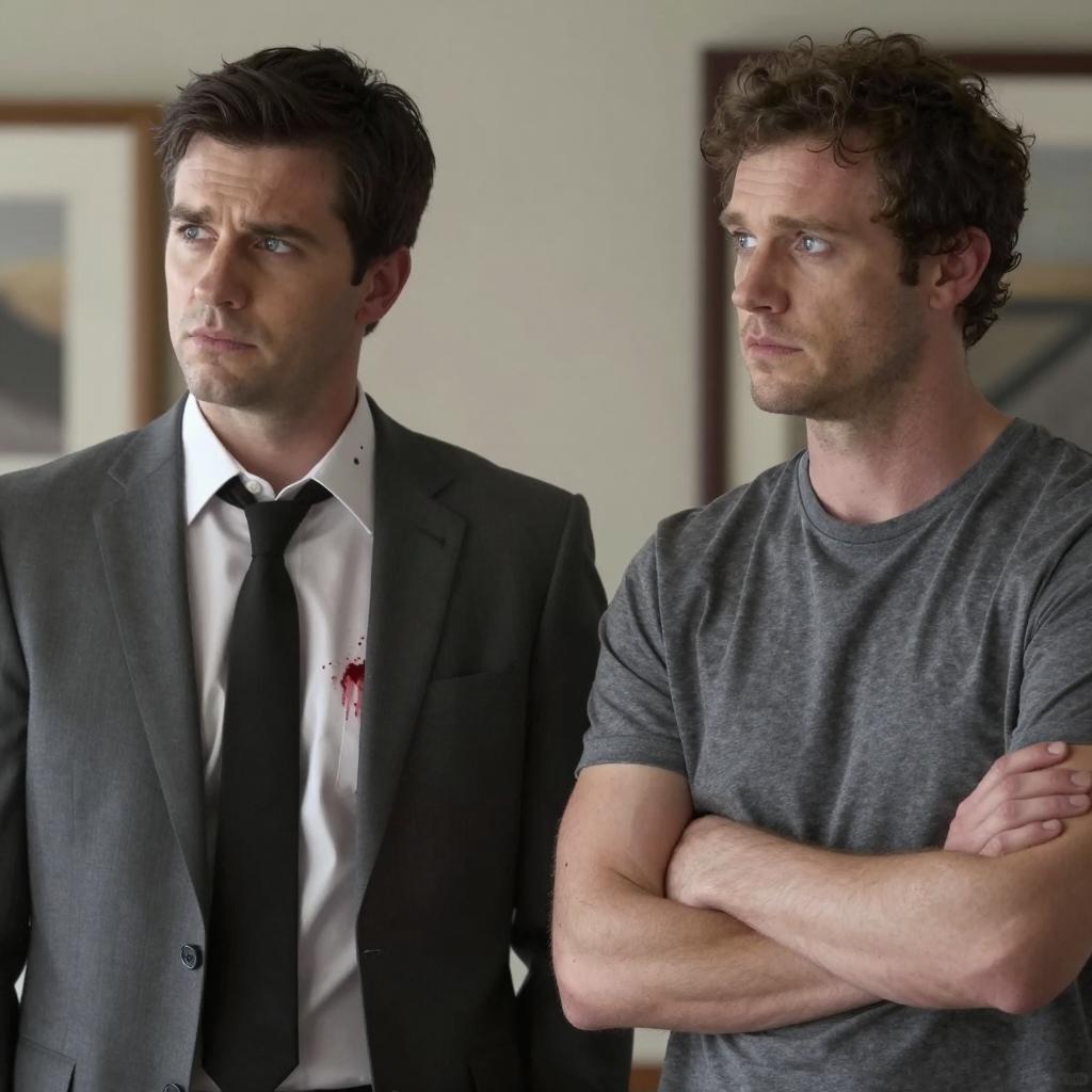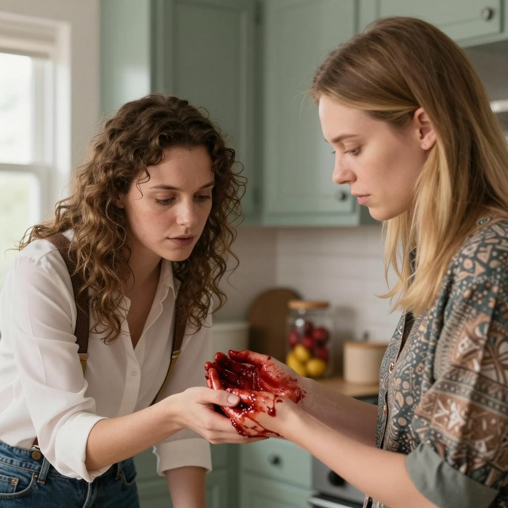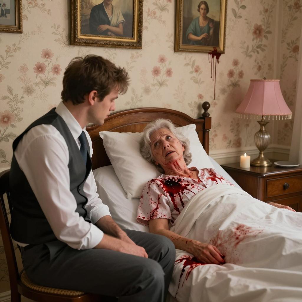 A man with short brown hair and a white shirt with a vest sits on a chair beside a bed. An elderly woman with gray hair lies on the bed, blood covering her, the bed, and the sheets. A pink lampshade is on a wooden nightstand. The wallpaper is floral, with two framed paintings. Blood drips from above the bed. The man's expression is concerned, the woman's expression is distressed. Two people.