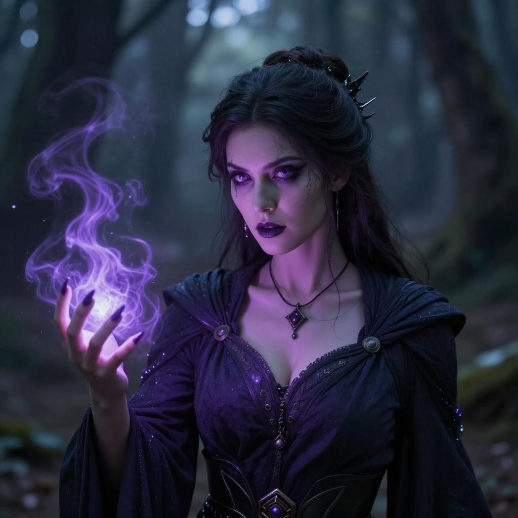 An artistic fantasy portrait of a female necromancer, showcasing a detailed face and dark garments, set against an ethereal forest backdrop as she conjures a mystical purple energy.