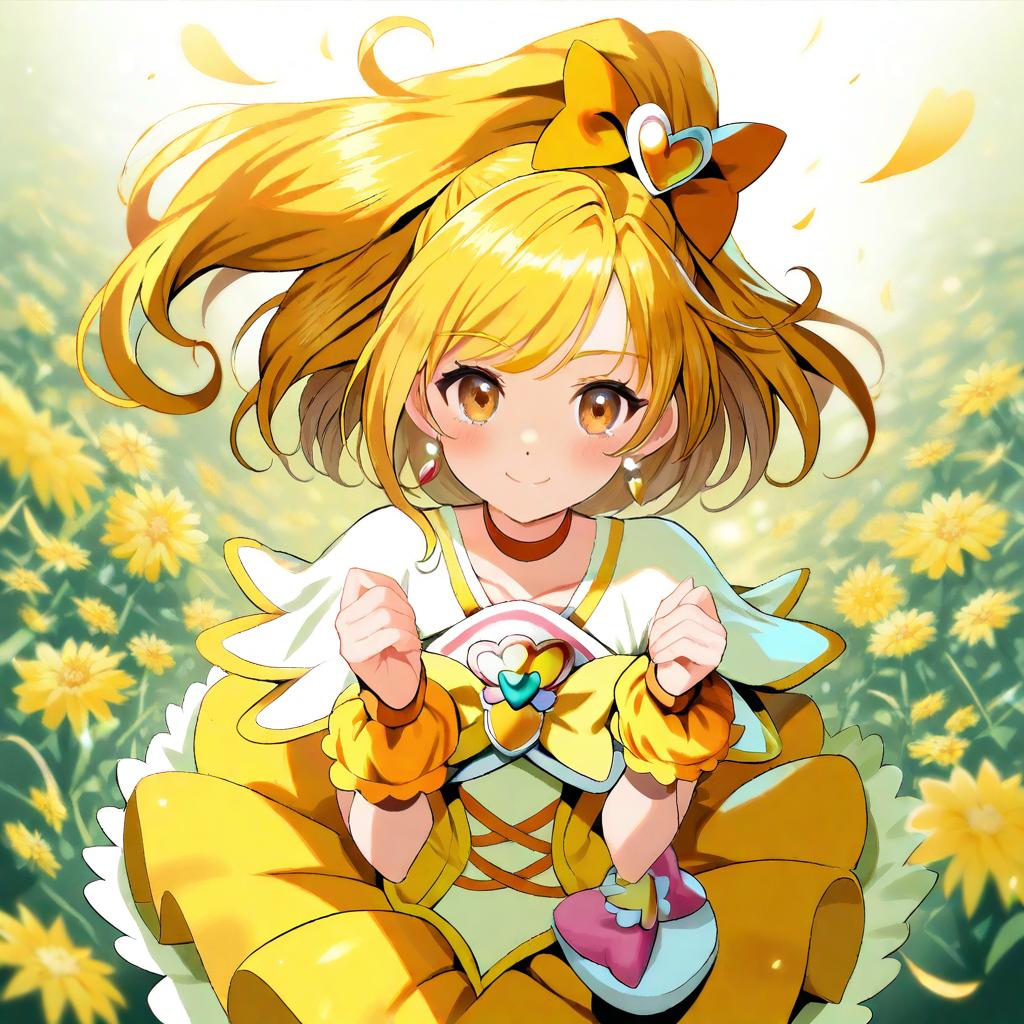 Anime-style illustration of a magical girl with blonde hair and yellow eyes, wearing a yellow and white dress adorned with heart motifs. She has a large hair bow with a heart ornament, orange choker, and matching wrist cuffs. The character is set against a backdrop of yellow flowers in a softly lit field, creating a bright and cheerful atmosphere.