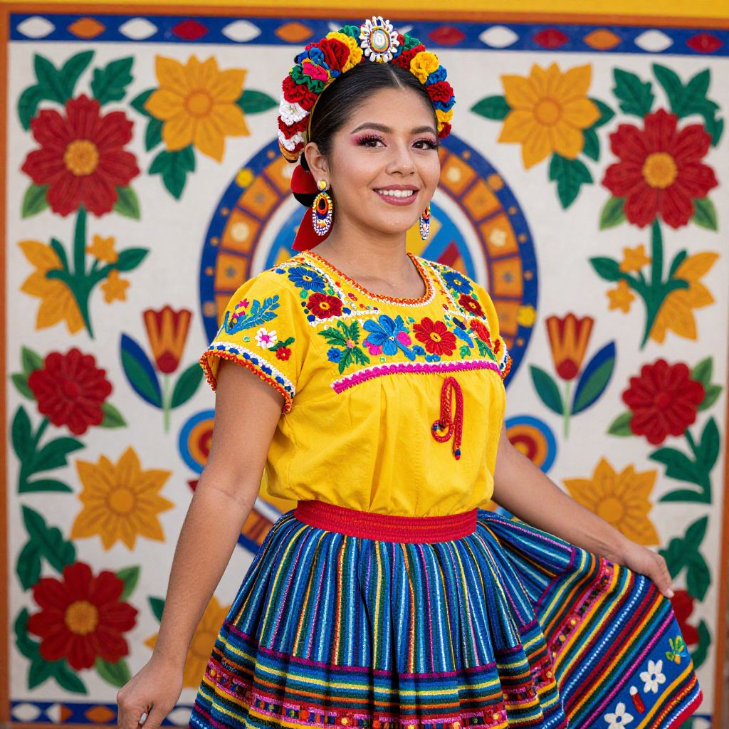 Vibrant depiction of a traditional Mexican woman in colorful attire, featuring a yellow blouse adorned with intricate embroidery, a striped skirt, and a matching headpiece, set against a lively background of floral patterns and cultural motifs.