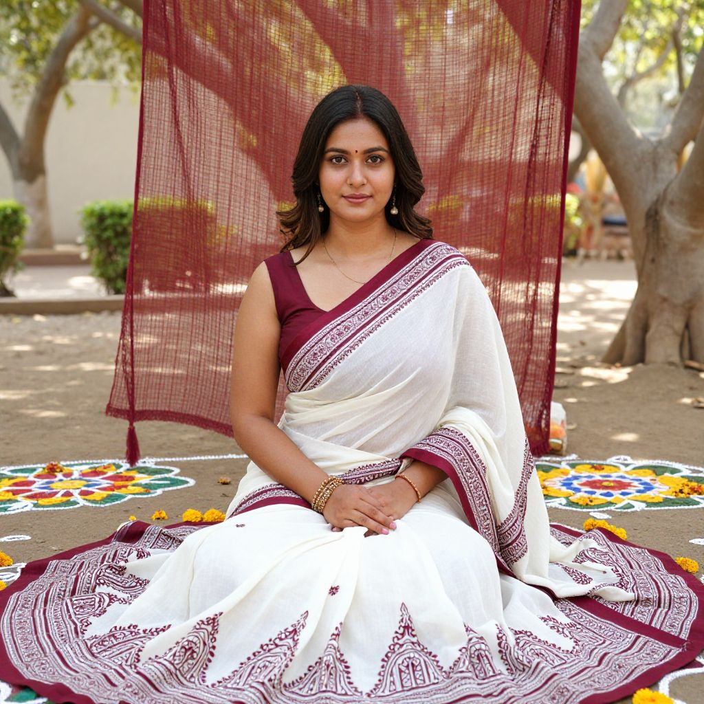 A graceful Indian woman with a soft, calm expression and medium-dark brown skin, dressed in a classic white and maroon Indian costume outfit — a saree with intricate hand-block print patterns — seated under a canopy of banyan trees in a rural garden in Rajasthan, with flowers and traditional rangoli patterns visible on the ground.. The woman has big tits and cute face