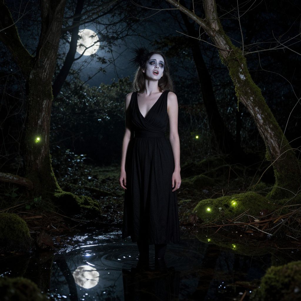 Photograph of a pale-skinned woman standing in a dark, mystical forest at night. She wears a black, sleeveless, V-neck dress with a feathered headpiece. Her face is painted white with dark red lips, resembling a ghost or spirit. The background features a full moon shining through the trees, casting a silver glow on the reflective water she stands in. Small, glowing yellow fireflies surround her, adding a magical touch. The scene is dark with deep blues and blacks, and the trees are covered in moss, enhancing the eerie, enchanting atmosphere.