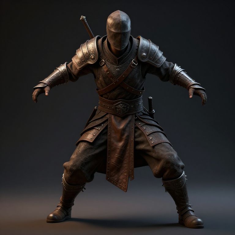 Create 3D character from photo of fantasy warrior, detailed armor design, textured leather and metal materials, dramatic lighting with strong contrasts, dynamic action pose, photorealistic render, digital sculpt.