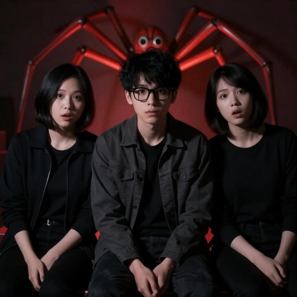 Photograph of three young people with short black hair, wearing dark clothing, sitting closely together in a dimly lit room. They have surprised expressions, with the central person wearing glasses. Behind them, a large, glowing red spider-like object is visible. The lighting creates a dramatic, high-contrast effect.