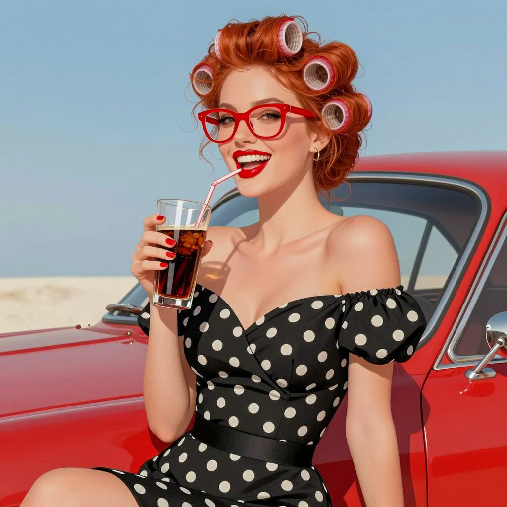 Digital illustration of a red-haired woman with curlers, wearing red glasses and a black polka dot off-shoulder dress. She is smiling widely and holding a glass of soda with ice and a straw while sitting in front of a red vintage car under a bright blue sky.