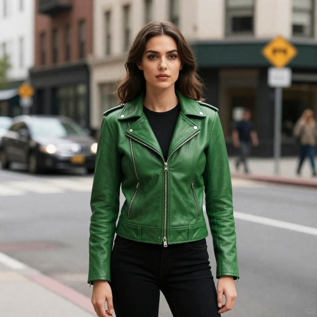 Doc Ock Costume Girl, woman in green leather jacket standing on street corner