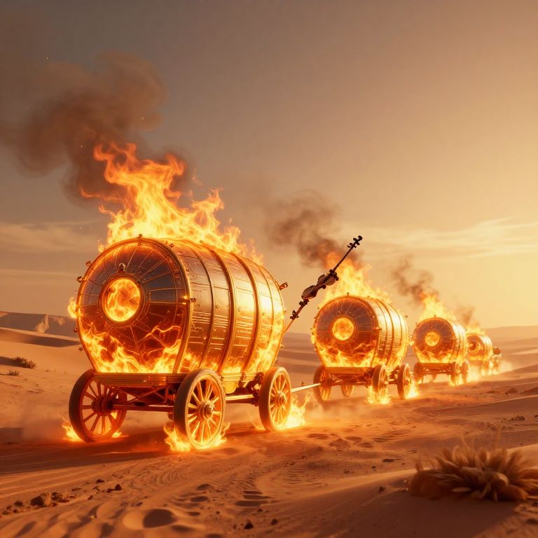 Caravans of ancient wooden wagons, each emitting vibrant orange flames from their tops, traverse a vast desert landscape under a fiery sunset sky, casting long shadows across rippling sand dunes.