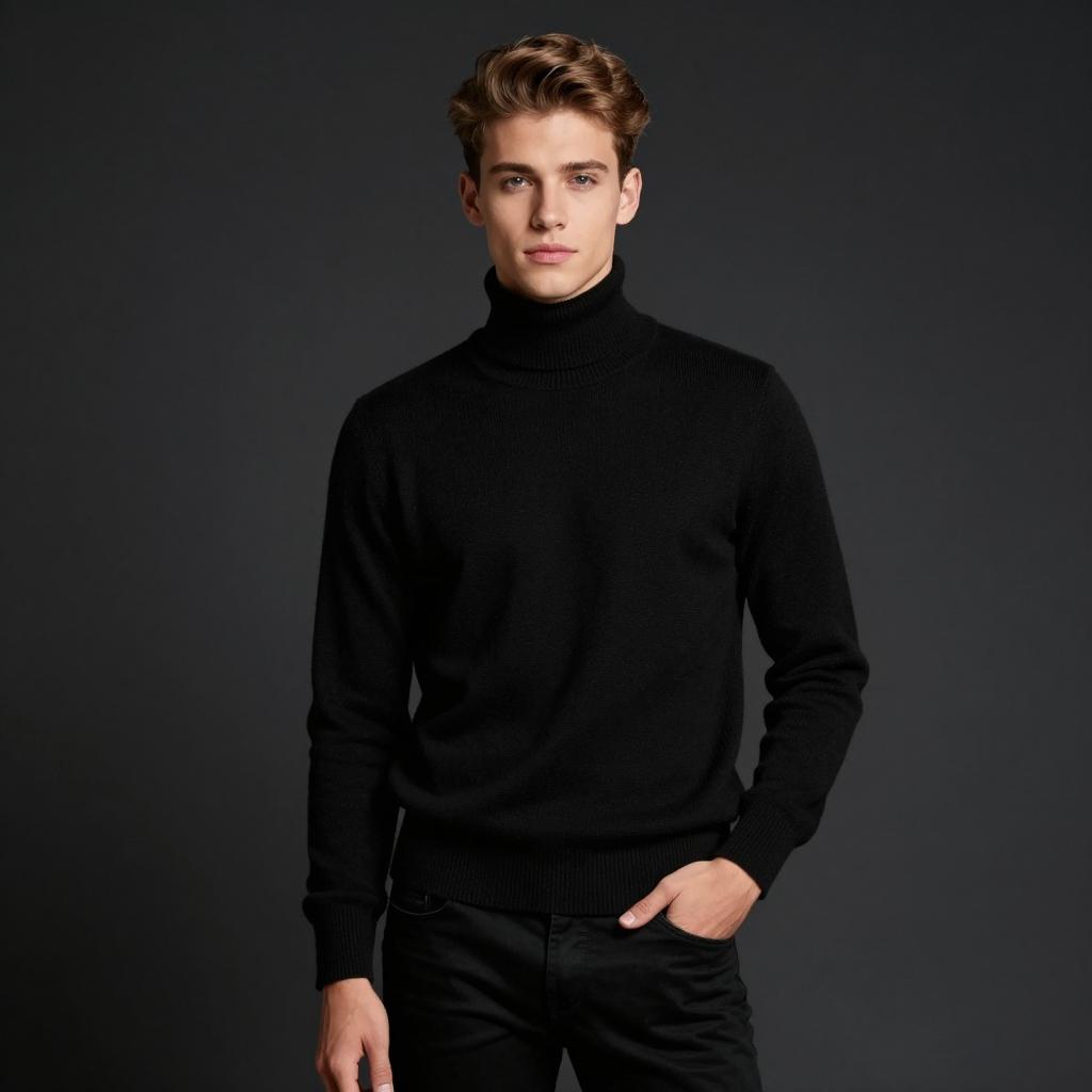 Portrait of a confident young man wearing a black turtleneck sweater and black pants, standing with one hand in his pocket against a dark background. The man has neatly styled light brown hair and a clean-shaven face, showcasing a calm and composed expression.