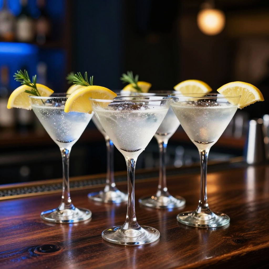 Photograph of four martini glasses lined up on a dark wooden bar counter. Each glass is filled with a clear, sparkling cocktail, garnished with a single lemon slice and a small sprig of green herb. The background is blurred with blue and white bokeh lights, giving a lively, club-like atmosphere. The glasses have elegant, thin stems and are arranged in a slightly diagonal row from the foreground to the background.