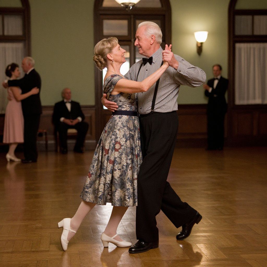 70-year-old couple dancing gracefully in a vintage ballroom, elegant attire with classic details, polished wood floor reflecting light, soft warm lighting, capturing joyous expressions and fluid motion, romantic and nostalgic atmosphere