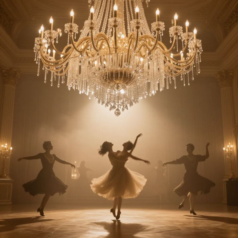 Photograph of a dimly lit ballroom with a grand chandelier hanging from the ceiling, casting a warm glow. Three silhouetted dancers, two on the left and one in the center, perform a dance with outstretched arms. The central dancer wears a flowing, tulle dress, while the others wear knee-length, flared dresses. The background features tall, ornate columns and soft, hazy light. The dancers' movements and the chandelier's sparkle create a dramatic, elegant atmosphere. The image has a nostalgic, vintage feel with rich, warm colors and soft light.