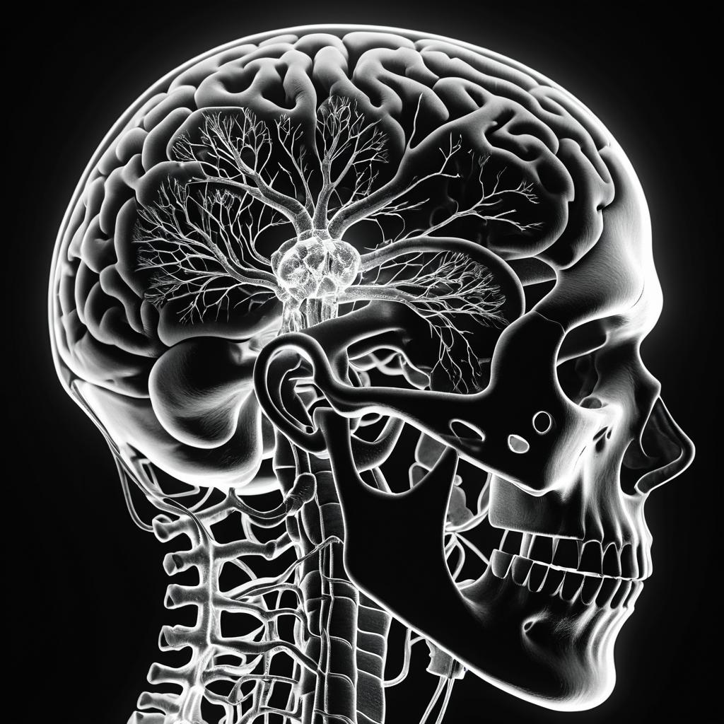 Ultra-realistic 3D rendering showing a transparent human skull with detailed brain anatomy and intricate neural pathways. The image highlights the fusion of neuroscience and abstract artistic patterns in monochrome with backlighting, featuring delicate and ethereal designs. Created with advanced ray tracing to enhance depth and detail.