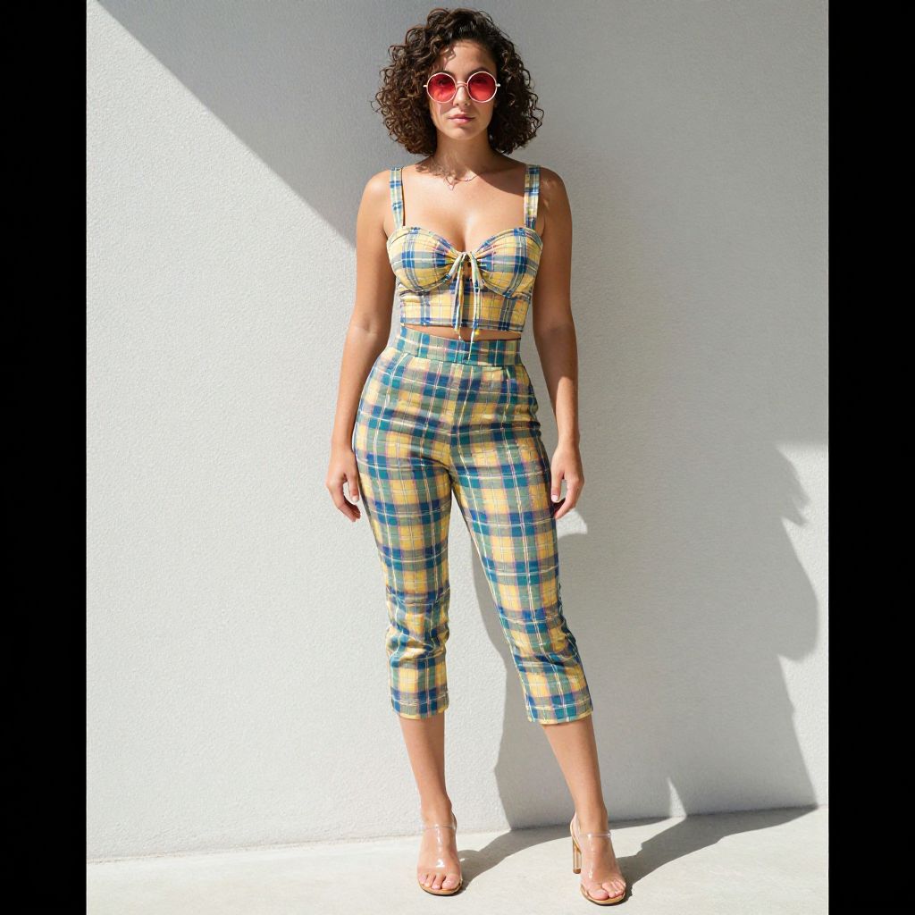 "Woman, retro-inspired, plaid cropped bustier top with front tie, sweetheart neckline, high-waisted plaid capri pants in coordinating colors, clear strap sandals with chunky heels, round pink-tinted sunglasses, curly bob hairstyle, bright daylight, plain wall with shadow detail.. Sexy. Pretty face and beаutiful eyes. Big breasts."