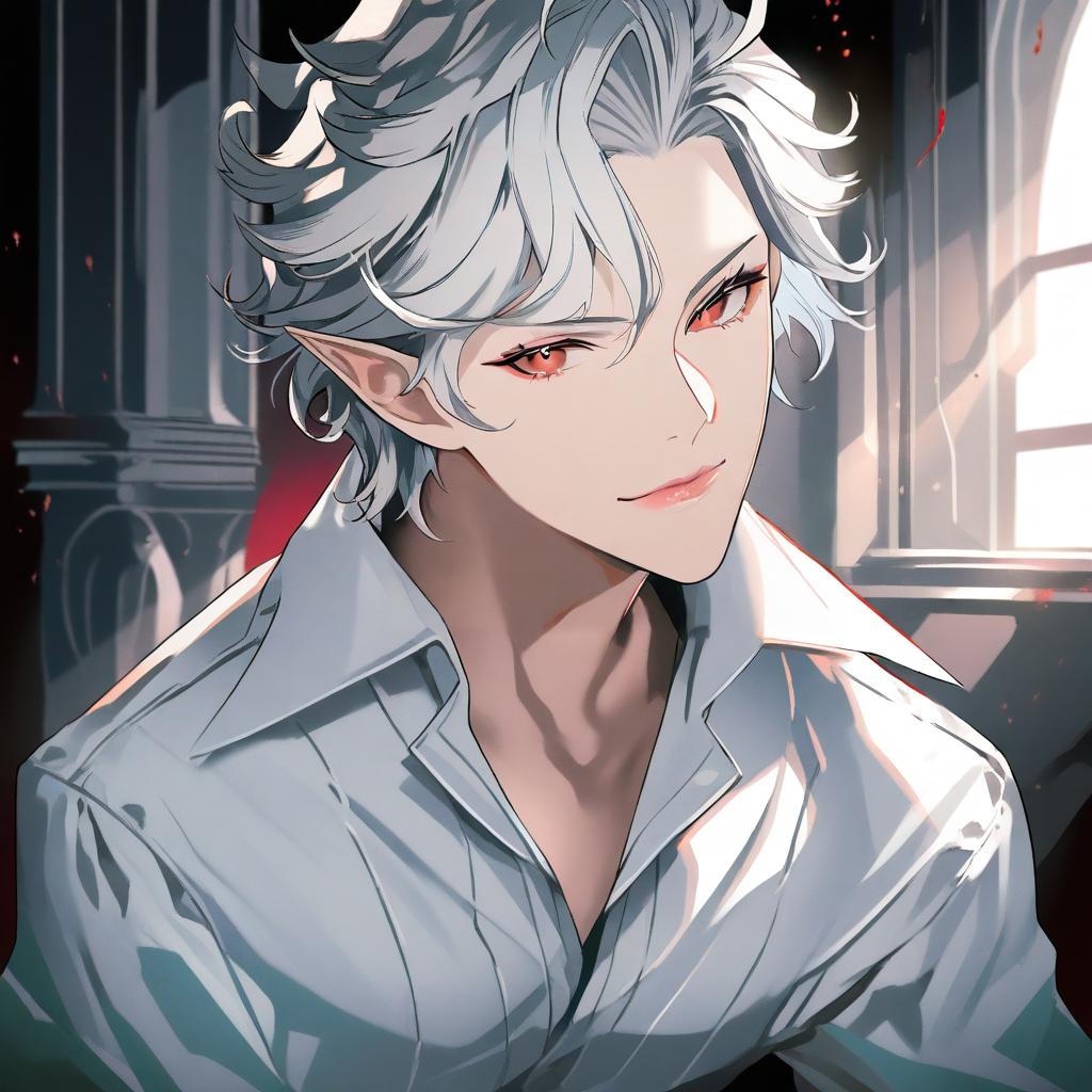 Astarion, baldur's gate, 1boy, red eyes, short hair, white hair, grey hair, white shirt, vampire, elf, by artist tsurukame, animagine