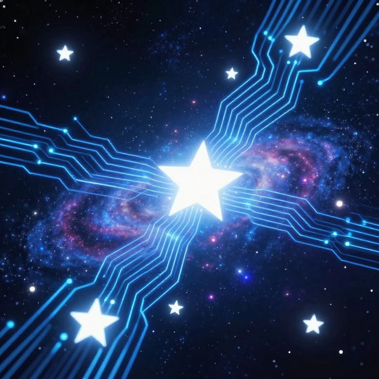 Digital artwork depicting a bright white star at the center, surrounded by glowing blue circuit lines radiating outward. The background is a deep, starry night sky with scattered stars and a nebula-like cloud of purple, pink, and blue hues. Additional white stars are positioned at various points along the circuit lines. The image has a futuristic, cybernetic aesthetic, blending elements of space and technology. The overall effect is dynamic and luminous, with a strong contrast between the bright white and blue elements and the dark, starry backdrop.