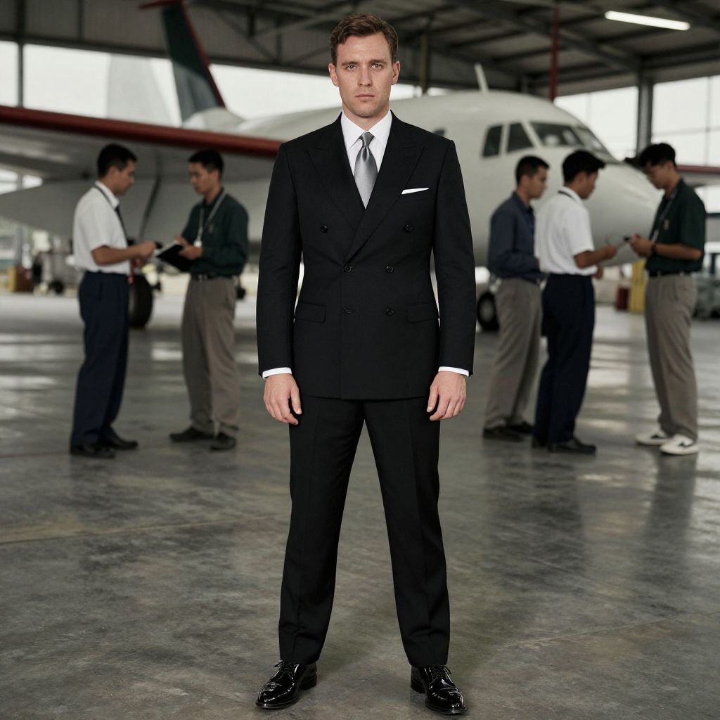 A man, double-breasted black suit, textured white dress shirt, matte silver tie, black patent leather dress shoes, tailored black dress pants, bustling technicians, gleaming hangars, hand-tinted photograph, confident expression. Man has masculine face and piercing eyes