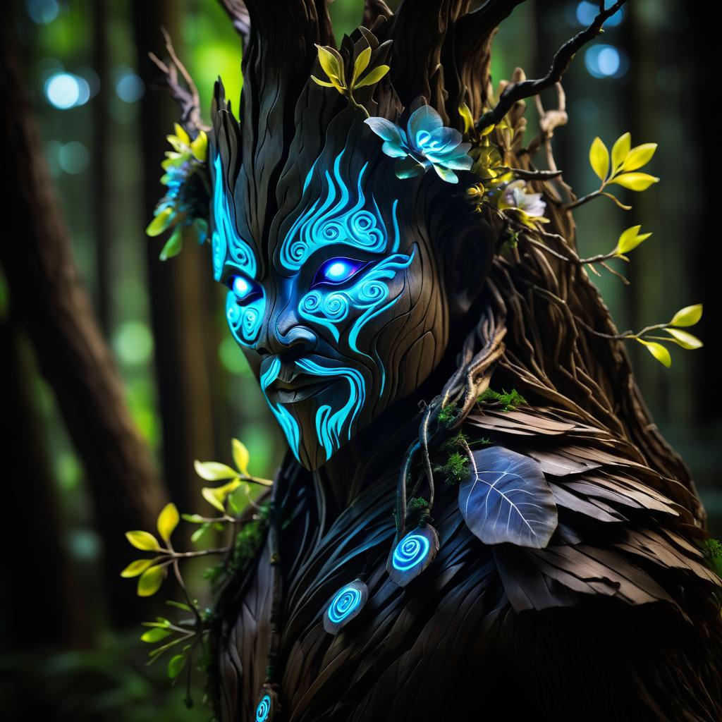 Portrait of an ancient tree spirit made of twisted bark with bioluminescent flowers, dramatic lighting.