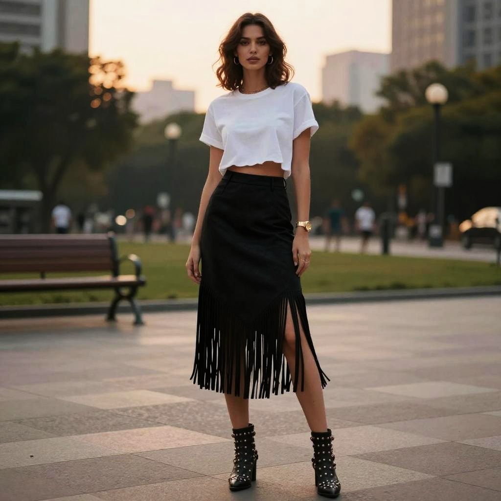 A tall woman in a contemporary boho style, wearing a cropped white t-shirt and a black suede midi skirt with fringe detailing, paired with studded ankle boots. She has a casual gold watch and wavy lob hairstyle, standing in a city park at sunset, surrounded by warm hues and soft light, in the visual style of Mappa Studio. Sexy. Pretty face and beutiful eyes