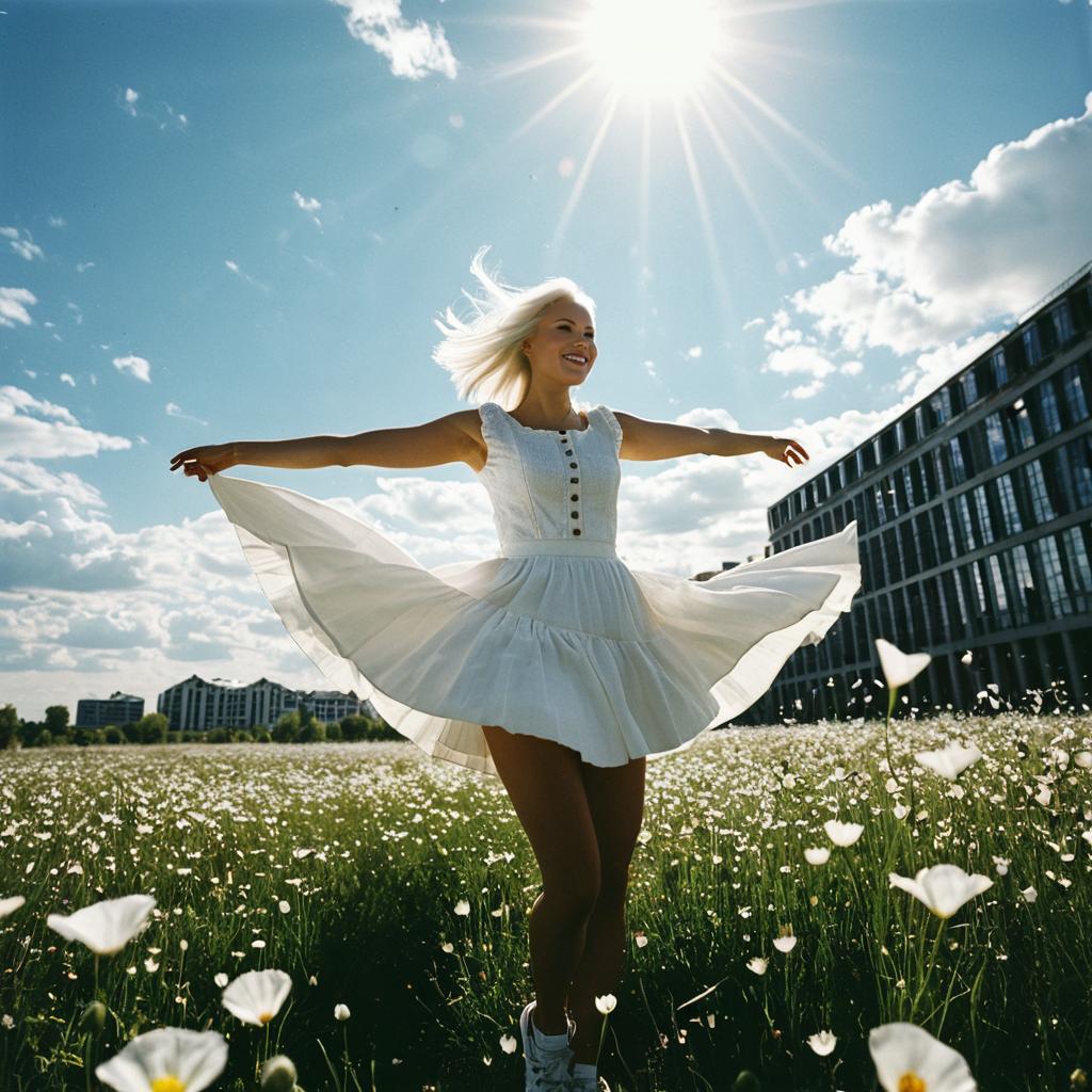 Photograph of a blonde woman standing in a sunlit field of white daisies, with a bright blue sky and scattered clouds in the background. She wears a sleeveless, white, button-down dress with a flared skirt, and white sneakers. Her arms are outstretched, and the skirt is blowing in the wind. Sunrays emanate from the upper center, casting a glowing light on her. A modern, dark building is visible on the right, contrasting with the open field. The scene is vibrant and joyful, capturing a moment of freedom and happiness.