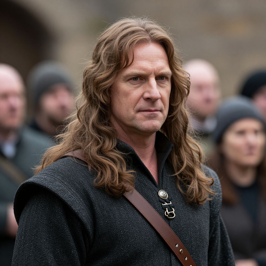 Photograph of a middle-aged man with long, wavy, brown hair and fair skin, wearing a dark, textured, medieval-style tunic with a brown leather strap crossing his chest. He has a serious expression and is slightly turned to his left. In the blurred background, several indistinct people, mostly men, are wearing dark, medieval clothing and beanie hats. The setting appears to be outdoors with a stone wall visible in the background. The image has a realistic, cinematic quality, with a focus on the man's face and upper body.