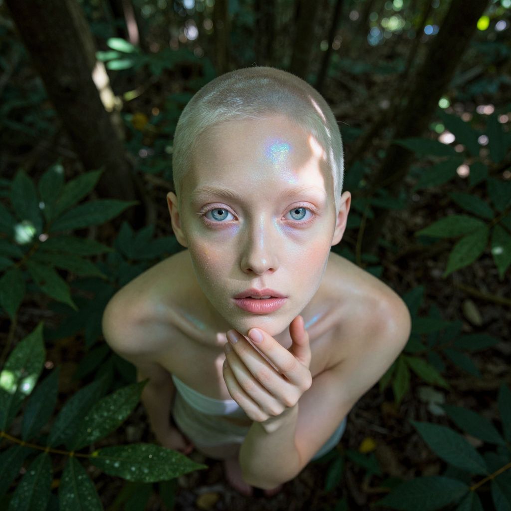 Photograph of a bald, fair-skinned, androgynous person with striking blue eyes, standing in a dark, dense forest. The individual's face is illuminated by dappled sunlight, highlighting their smooth skin and delicate features. They are topless, with their right hand gently touching their chin. The background is filled with dark green leaves and shadowy tree trunks, creating a contrasting backdrop to the bright, reflective light on their face. The image has a surreal, ethereal quality, emphasizing the person's ethereal beauty amidst the natural, dark forest setting.