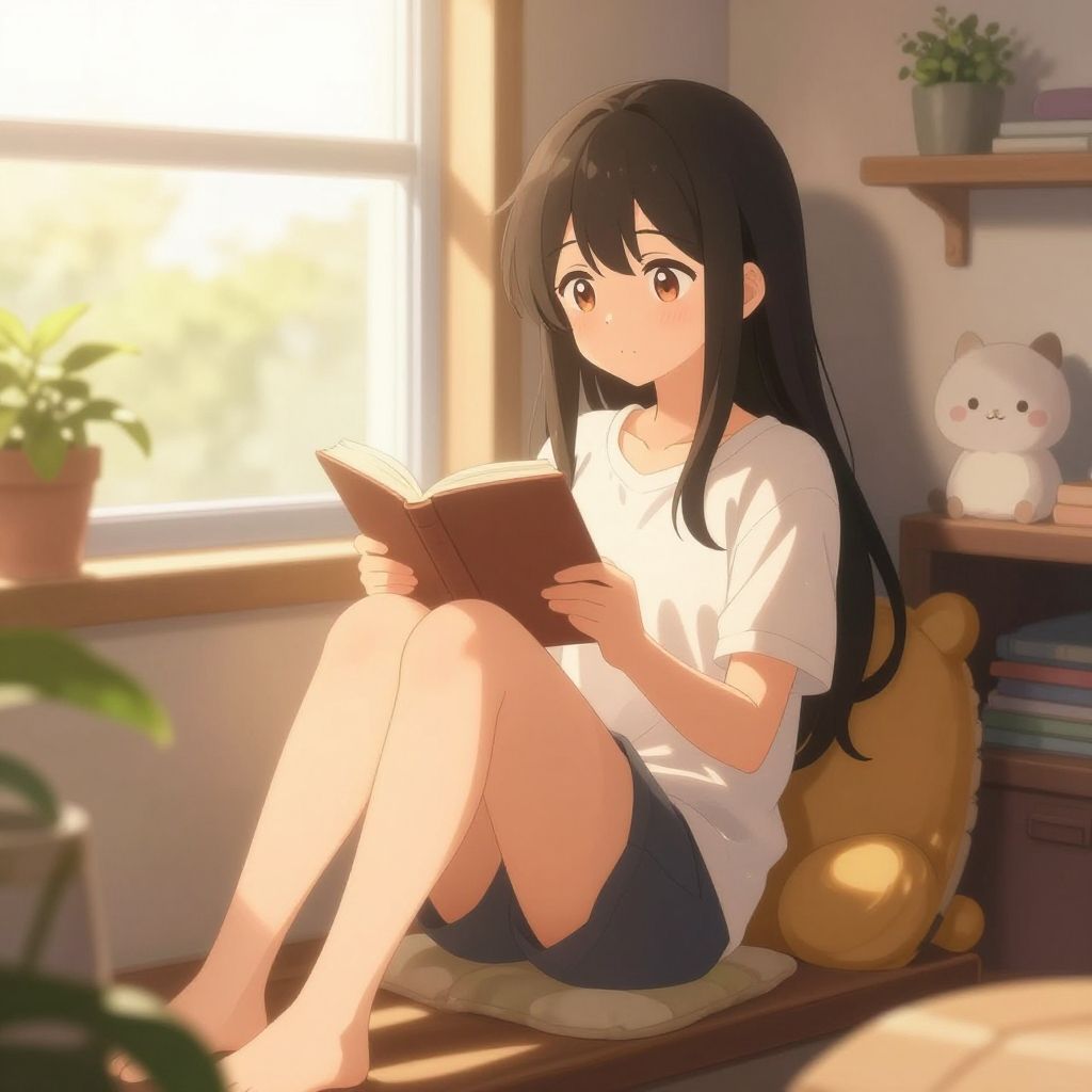 Anime-style digital drawing of a black-haired girl in a white shirt and blue shorts, reading a book by sunlight, with a teddy bear and p