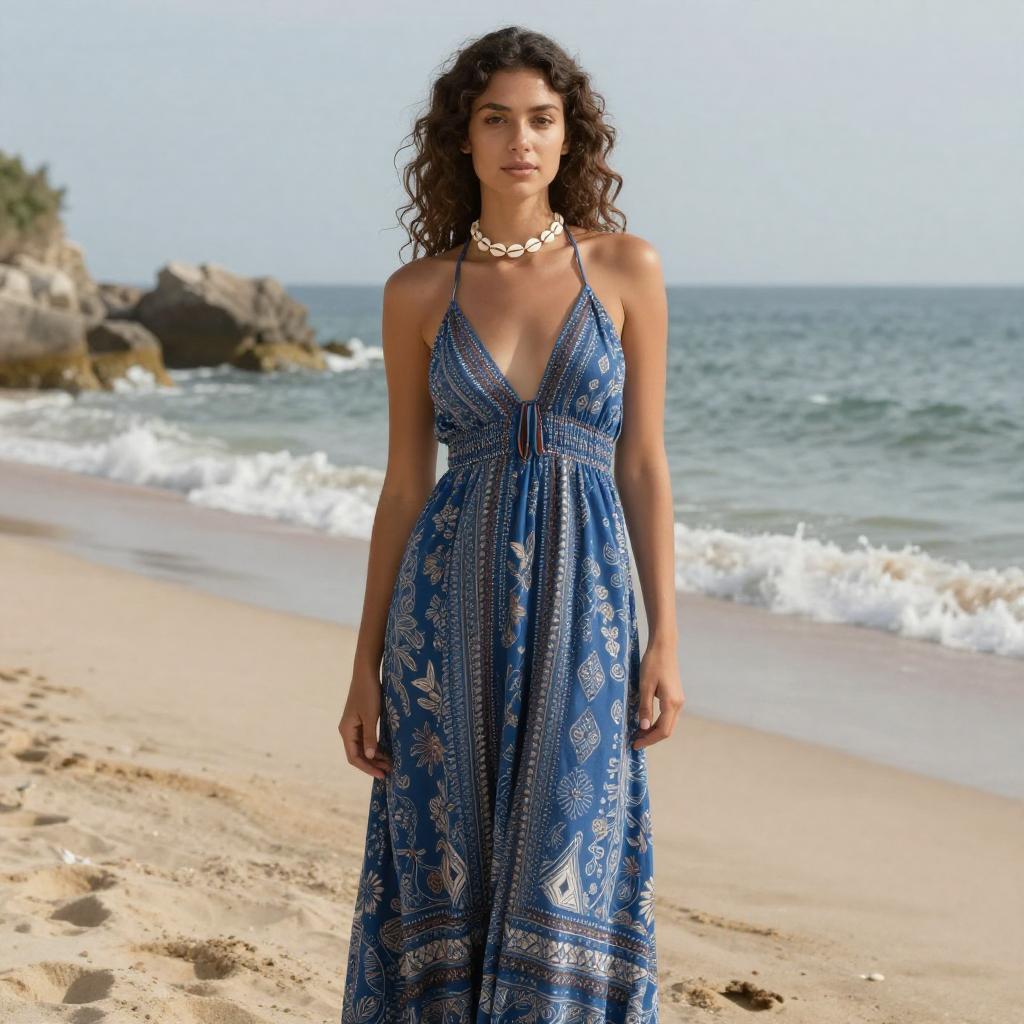Portrait of a young woman with loose curly hair wearing a blue patterned bohemian maxi dress and a shell necklace, standing on a sandy beach with the ocean and rocky coastline in the background, captured in soft natural daylight.