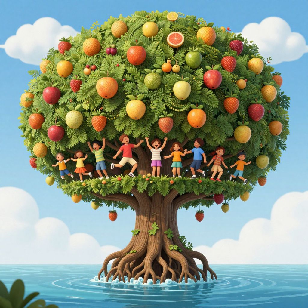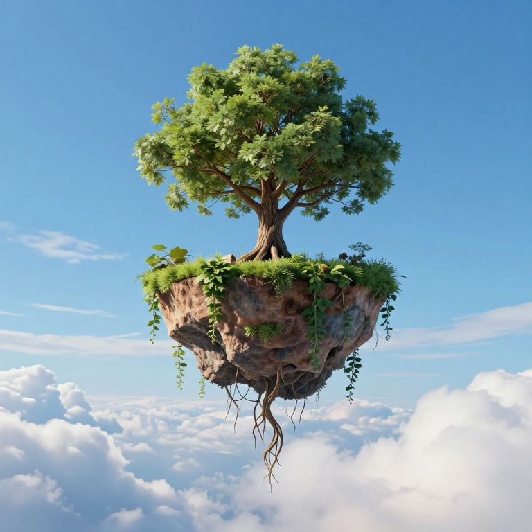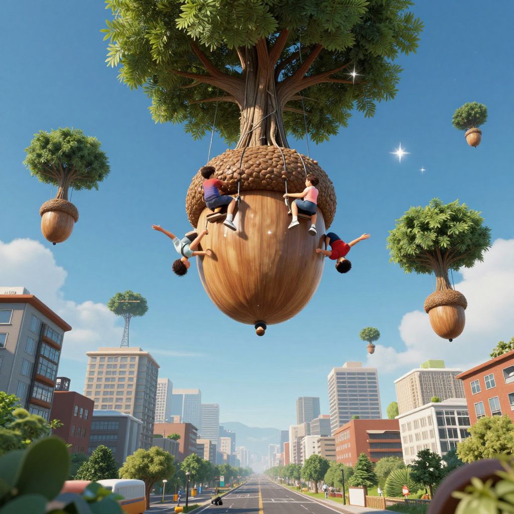Children ride upside-down on gravity-defying acorns, racing through an urban sky where trees grow roots upward toward the stars.